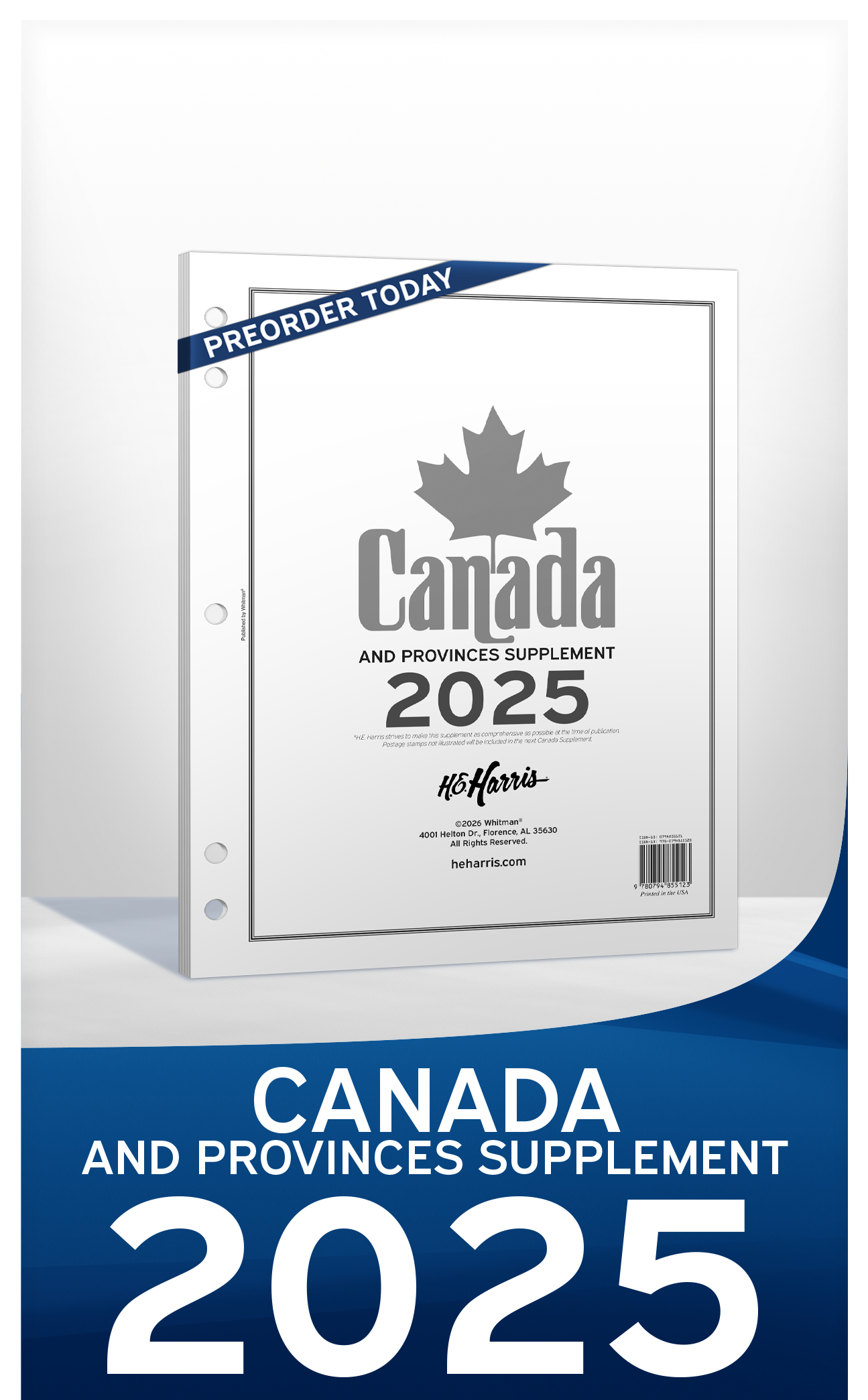 The 2025 annual page supplement for the H.E. Harris Canada Album includes issues released up to November 30, 2025. 60 pages printed on one side.